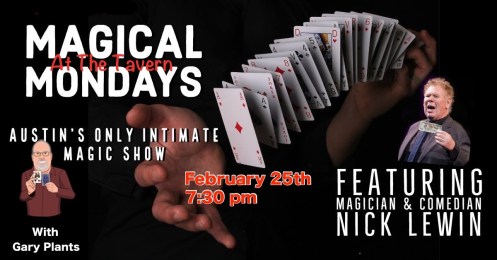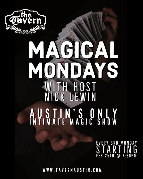 We are very pleased to announce a very exciting new magic project here in Austin. On February 25th, “Magical Mondays” will begin a series of magical events at the legendary (and haunted!) Tavern. A combination of close -up, stand up and parlor magic will feature both me and various other magicians performing in this great intimate venue. I believe it will become a very popular part of Austin’s vibrant nightlife.