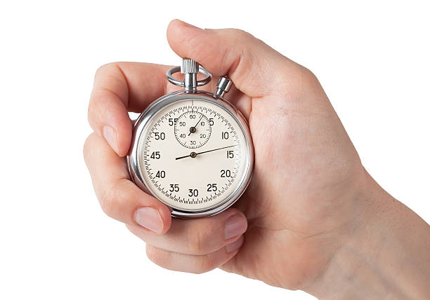 Close up of hand holding stopwatch, isolated on white background
